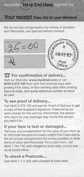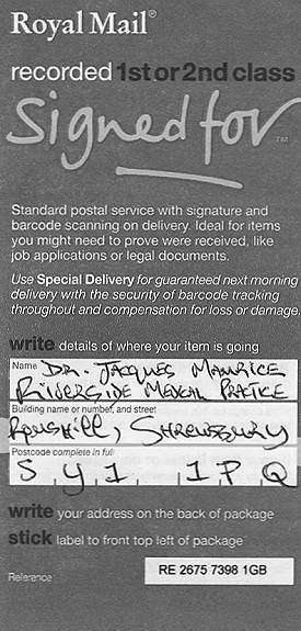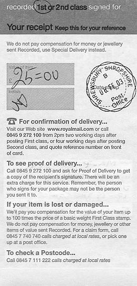 Royal Mail receipt for letter posted to Dr. Jacques Maurice on February 8th 2003: