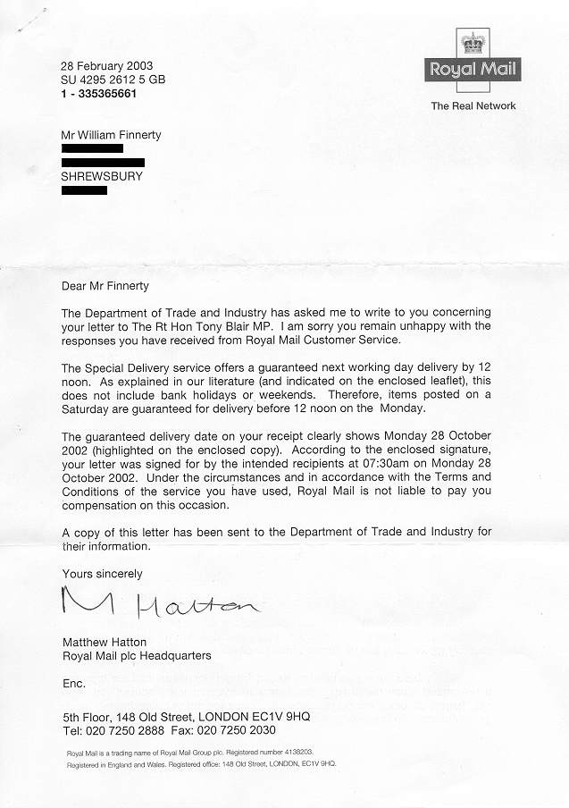 • Had it not been for the involvement of UK Prime Minister Mr Tony Blair MP, and the UK Department of Trade and Industry, it appears that Royal Mail would not (left to themselves) have ever provided proof of delivery for the letter in question.